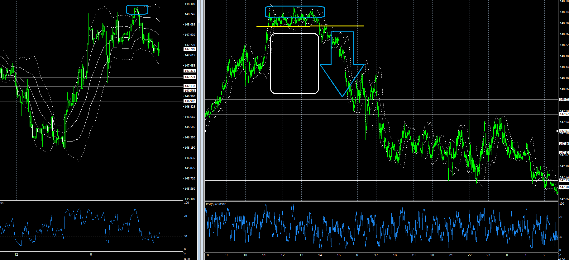 左の1時間では、青□ゾーンで何となくの天辺を付けているように見えます。