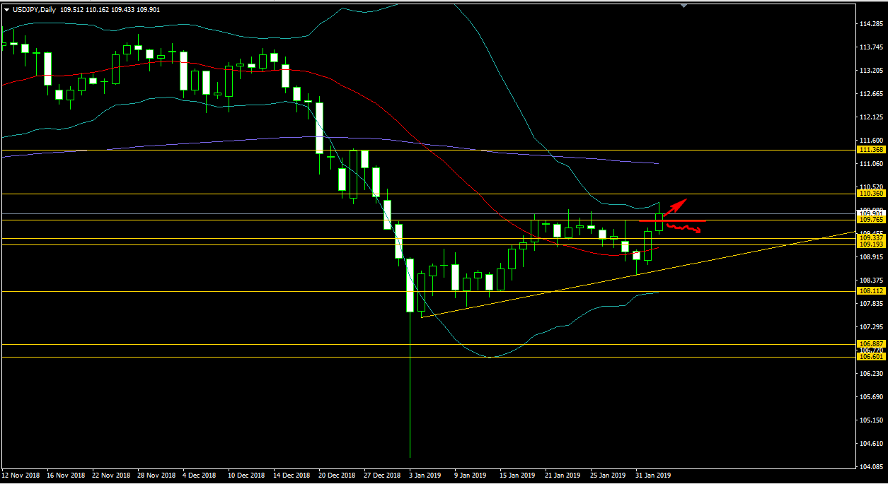 ドル円の日足チャートから見てみます。ドル円日足では、以前から強めと思われていた109.765円のレジスタンスラインを下から上抜けしたものの5本以前のローソク足同様に長い上ヒゲを付けを付けて止められている様相を呈しています。このまままたドル円109.965円と109.337円のラインの間に引き戻されてしまうのか、それとも109.765円のラインを下から上に抜けきるのかといったところです。下から上に抜けきった場合は新たなステージドル円109.765円と110.360円のラインの間を推移する事になると予想されます。