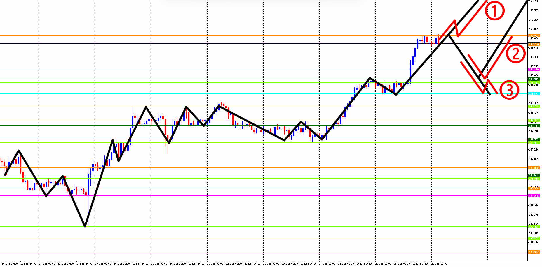 では早速、環境認識をやりながら、私の本日の最新トレード予想(エントリーポイントを3つに絞る)を解説していきます。
