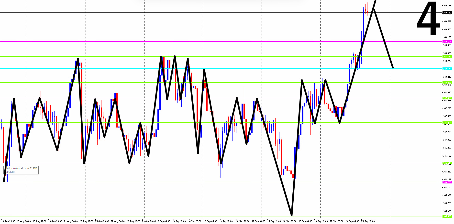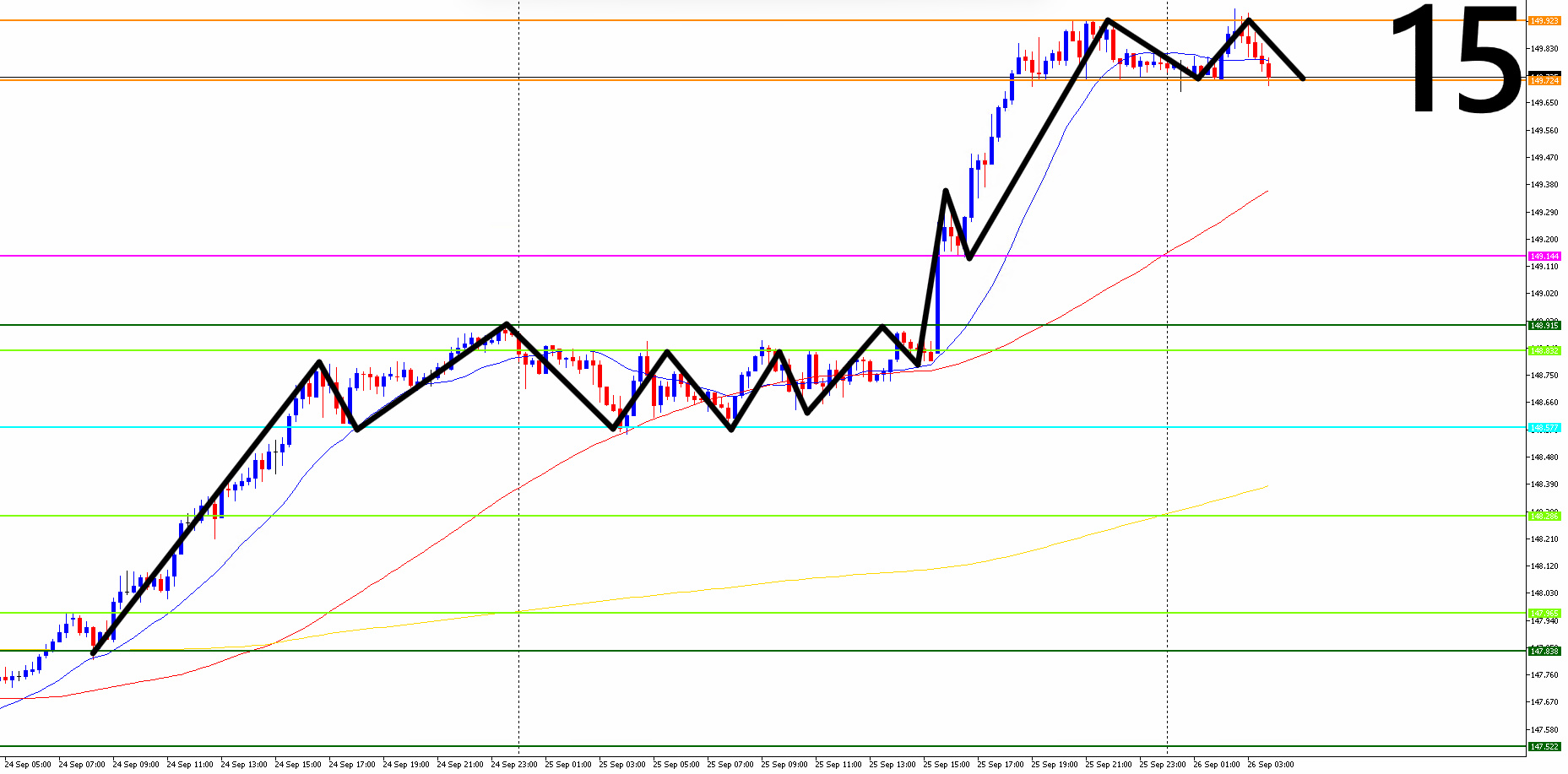 ●日足・4時間足・1時間足・15分足までの相場を水平線と波動(ダウ理論)を使って環境認識し、勝率の高いエントリーポイントを3つに絞る
