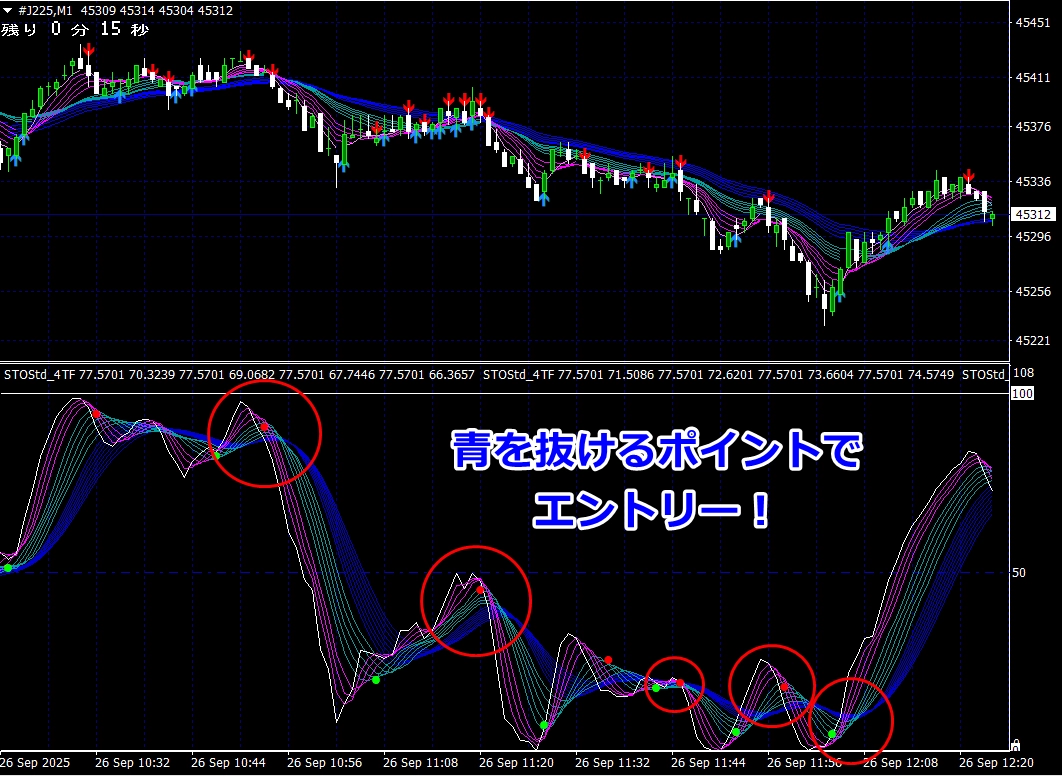 ※ サイン点灯=エントリーではありませんので、インジケーターが緑帯をすくい上げるような形状でない場合は、エントリーしません(サイン点灯でエントリーできる頻度は、数回に1度くらいです)。