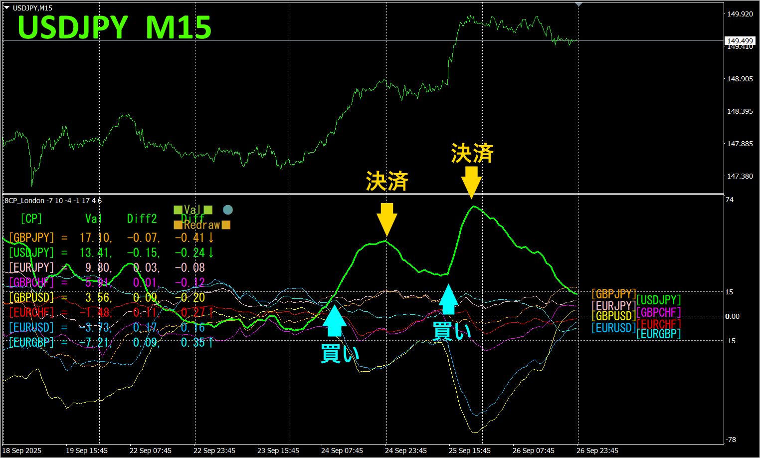 上半分は、USDJPYの15分足チャートです。下半分は、「8CP見える化インジケータ」によるものです、緑色太線のグラフがUSDJPYに相当します