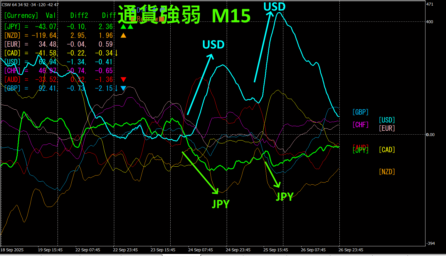 15分足の通貨強弱グラフを見ると、USDとJPYが、見事な逆相関関係になっていることがわかります。USDとJPYが収束から拡散に向かう時に、USD>JPYなので、USDJPYの買いで利益が得られます。2回ともUSDが強くなったことによる結果であることが、通貨強弱グラフから読み取れます。