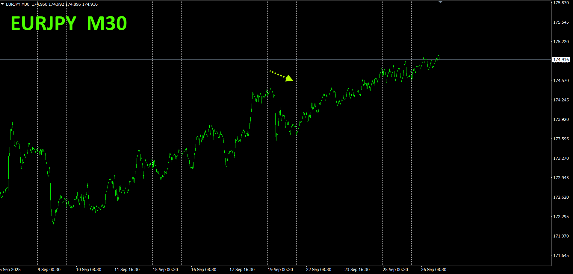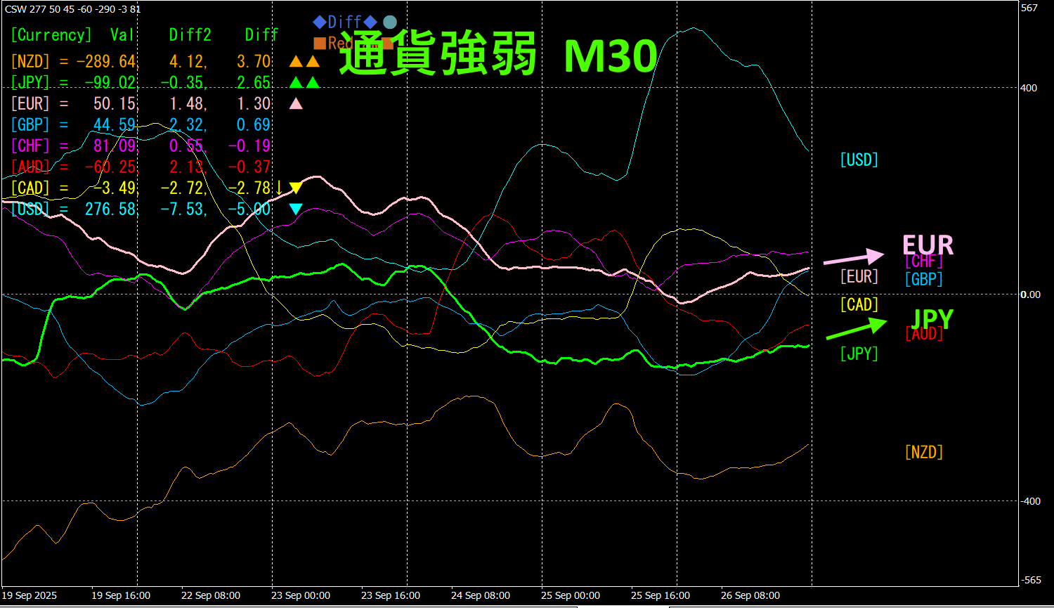 ピンク色がEUR、緑色がJPYです。EURもJPYも、水平からやや上向きになっています。通貨強弱としては、EURがJPYの上に位置するので、EUR>JPYの関係ですが、方向感が読めません。EURJPYは、レンジ気味に推移するものと考えられます。