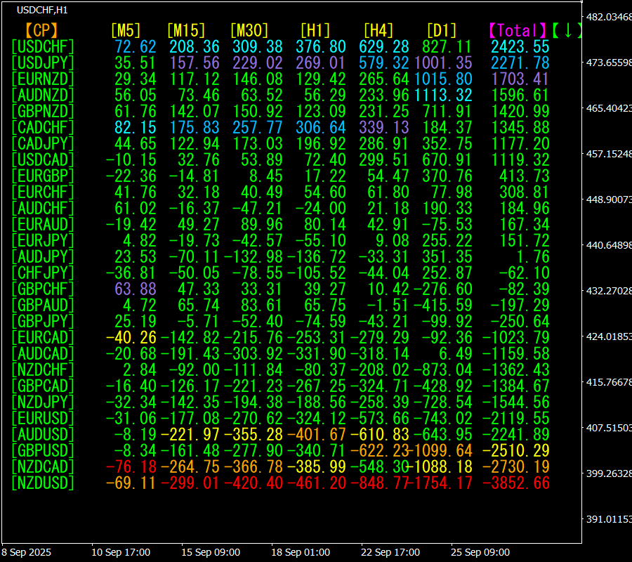 [Total]数値の降順に並んでいます。一番下にあるNZDUSDは、全ての時間足で赤色系の表示色になっています。Total数値が
