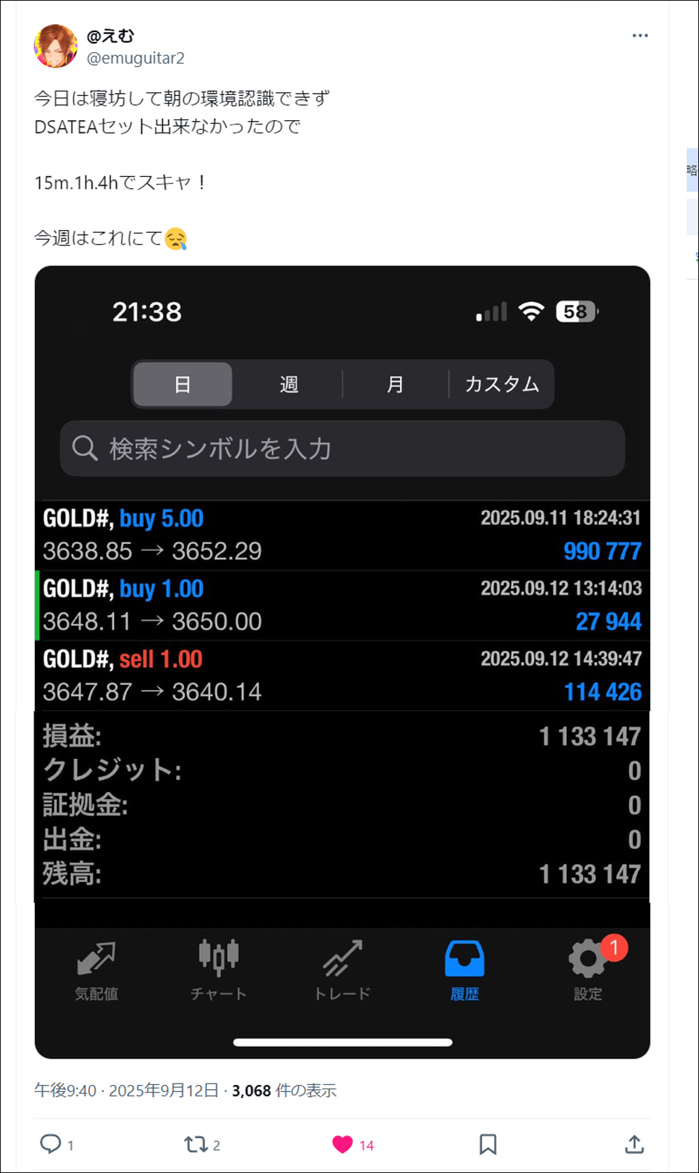 下記のポスト画像は天と地シリーズの敏腕ユーザー「@えむ」様の履歴です。会得すれば1日100万円も夢ではありません。