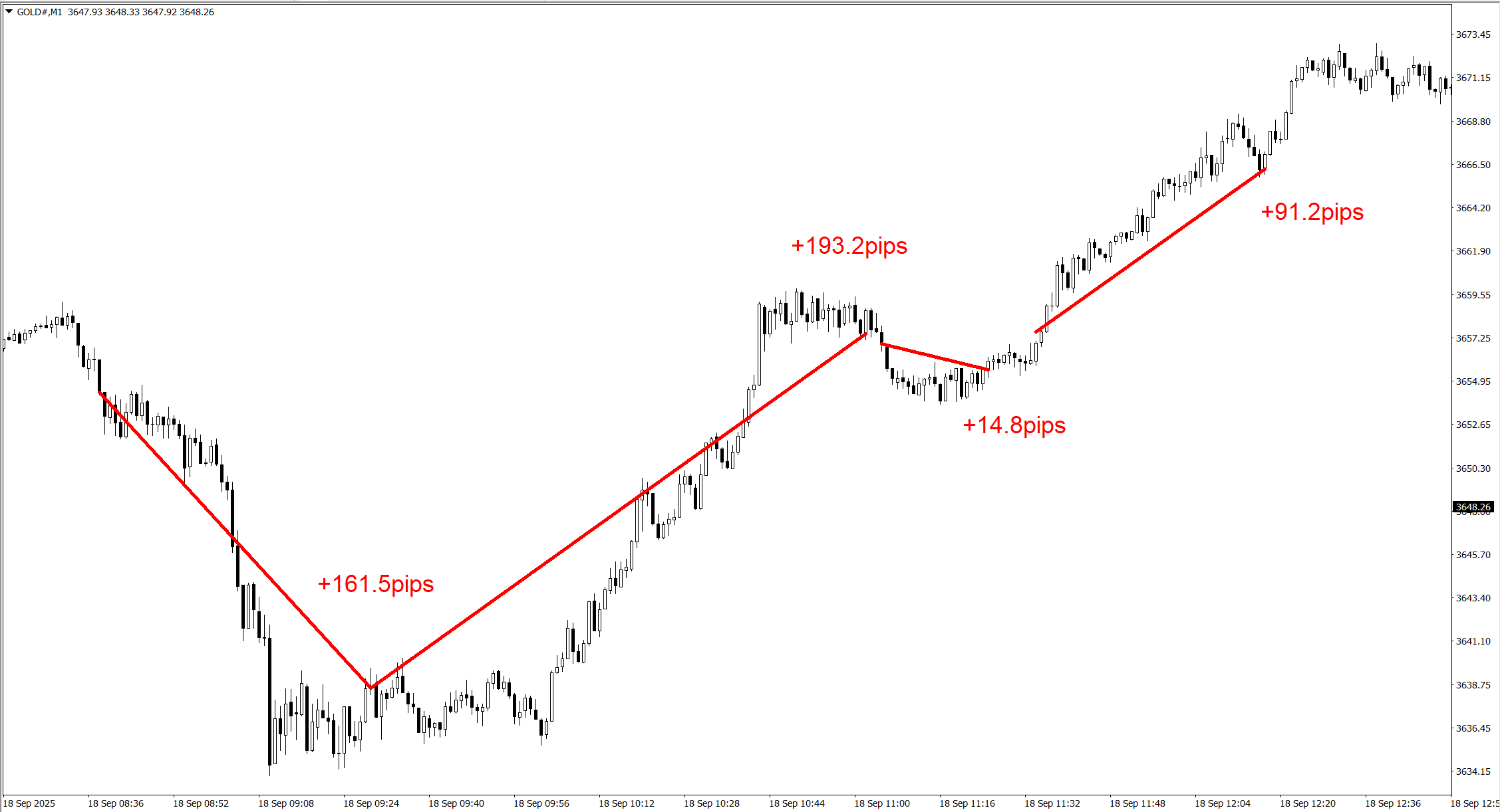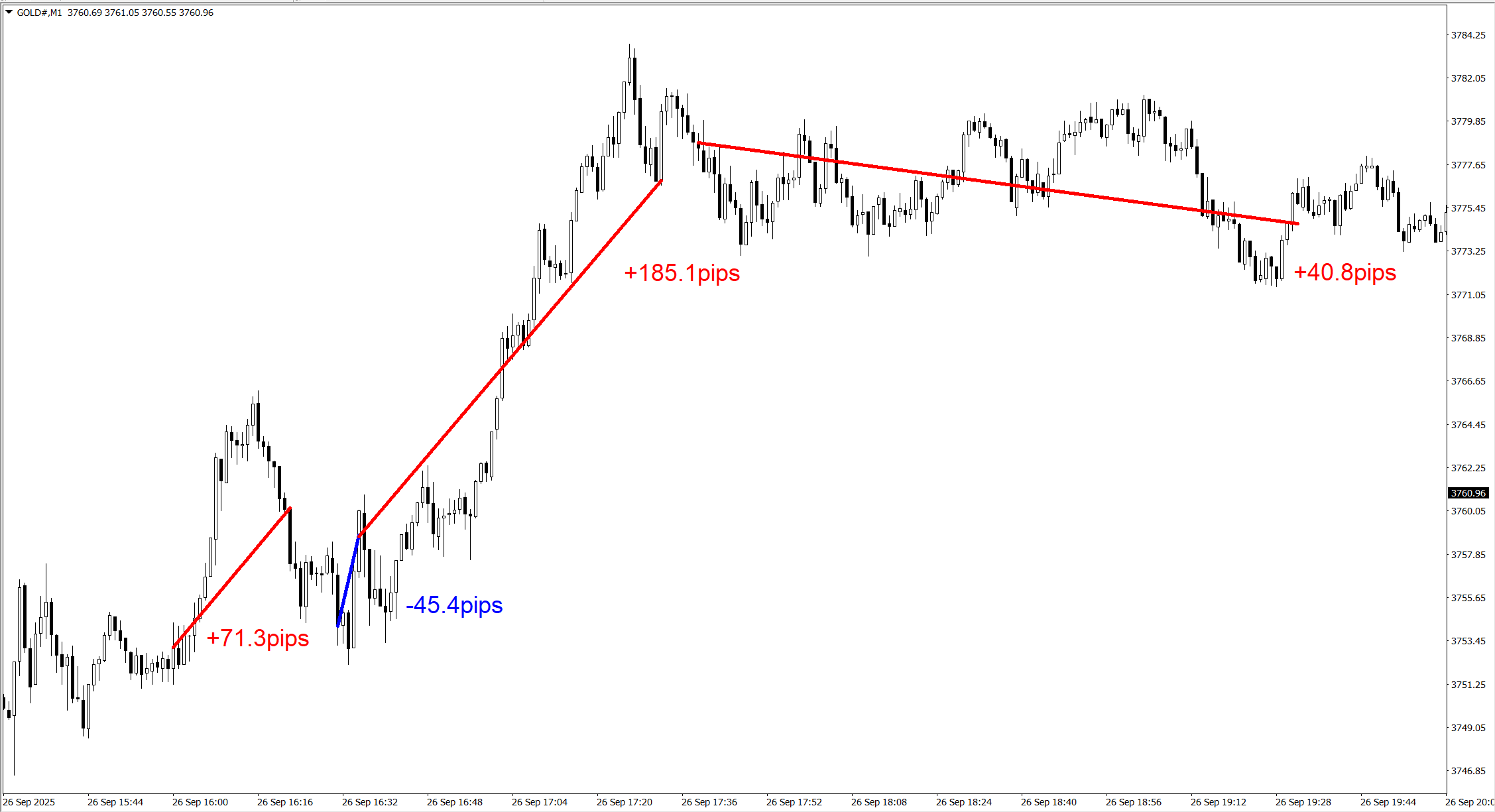 こちらは約4時間程で、合計460.7pipsの利益となっています。