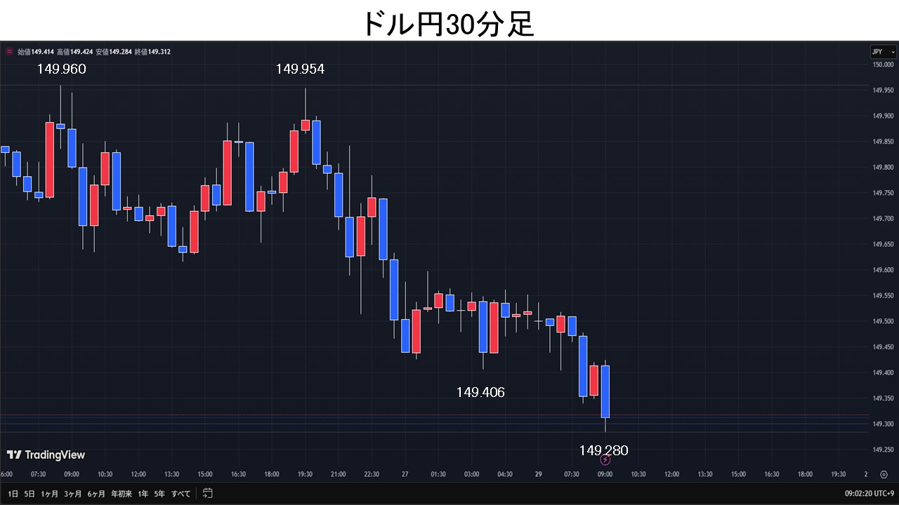 ドル円、一時150円手前まで上昇となるが、米PCE受け失速。