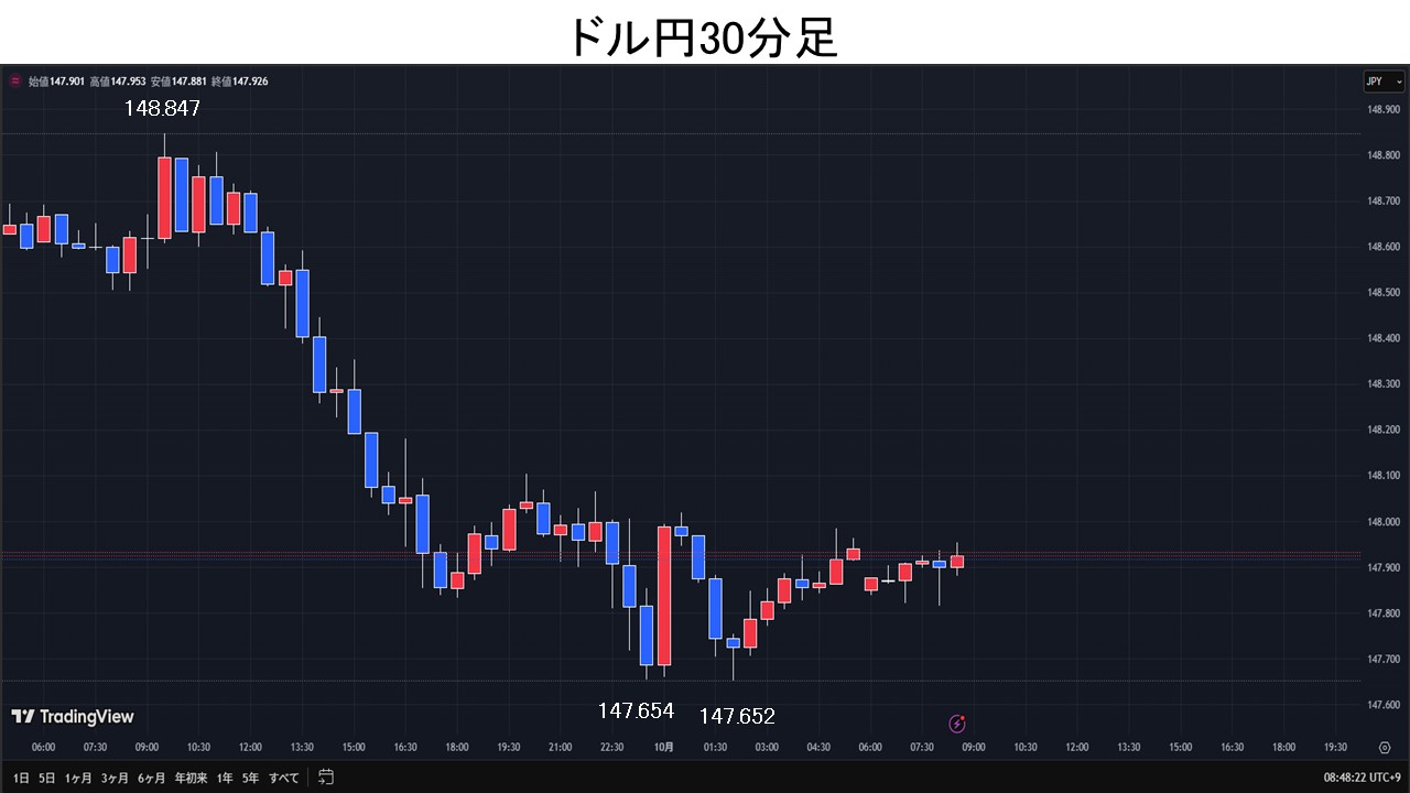東京時間、ドル円は、月末最終日の仲値で148.84円まで上昇となるが、その後は徐々に上値を切り下げた。新発2年物国債入札が低調な結果となり、国内中期債利回りの上昇が円買いを促すと一時148.16円まで下落。欧州時間、日銀が公表した「10-12月期の国債買い入れ予定」でオファー額が前回から減額されたことが分かると円買い・ドル売りが先行。また、米国で政府運営を維持するための「つなぎ予算案」について与野党の調整が難航する中、10月1日から米政府機関の一部が閉鎖されるとの懸念も強く、ドル売りが先行すると、ドル円は148円を割り込み147.65円まで下落となるが、その後は148円台まで買い戻された。NY時間、9月米シカゴ購買部協会景気指数や9月米消費者信頼感指数が予想下振れとなると、ドル円は147.65円まで下落。