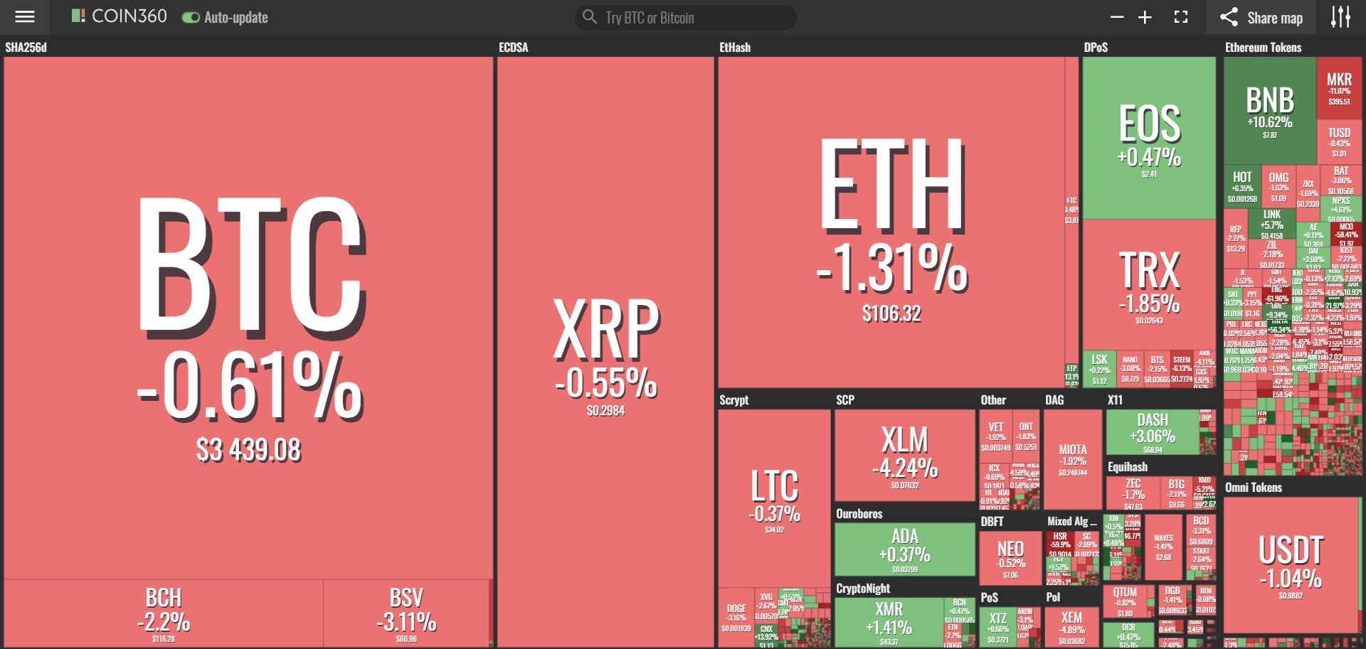 coinmarketcap(コインマーケットキャップ)のサイトから、ドミナンス(各銘柄が仮想通貨全体の時価総額に占めるパーセンテージ)を定点観測していきます。仮想通貨全般が下方向に大きく動き出している相場状況を受け、毎日更新することとし、仮想通貨業界を俯瞰および転換期を早期に発見することを目的とします。