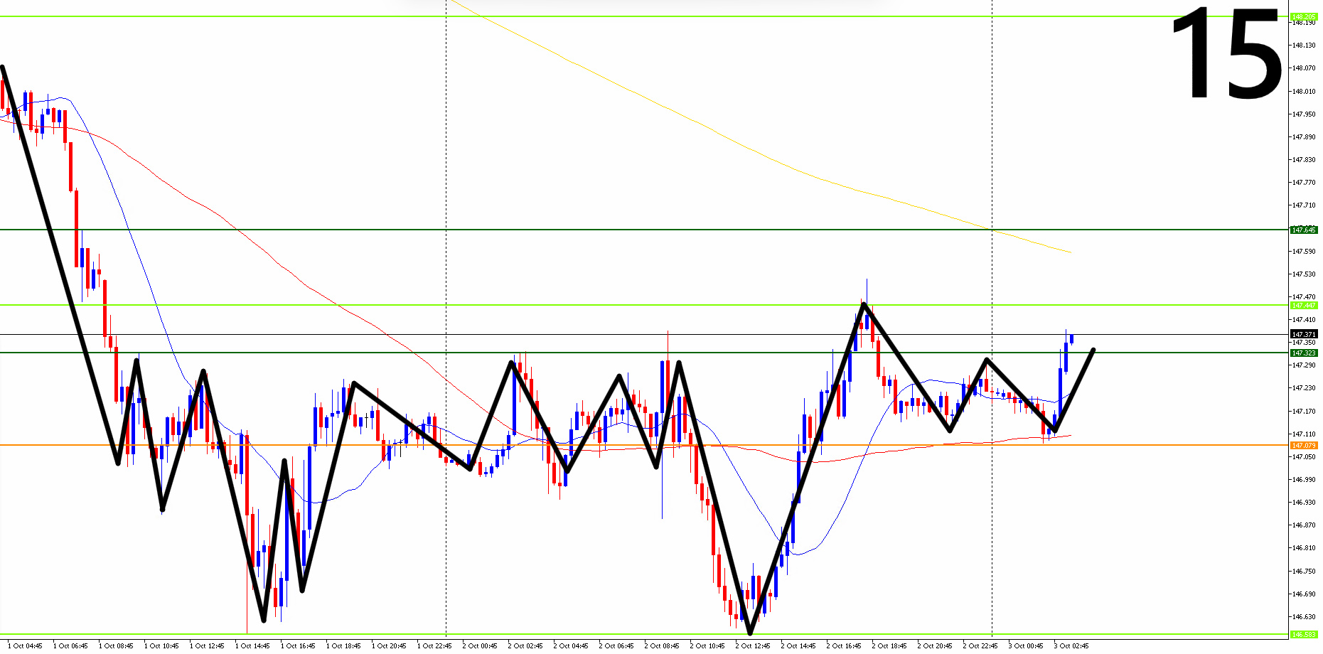 ●日足・4時間足・1時間足・15分足までの相場を水平線と波動(ダウ理論)を使って環境認識し、勝率の高いエントリーポイントを3つに絞る