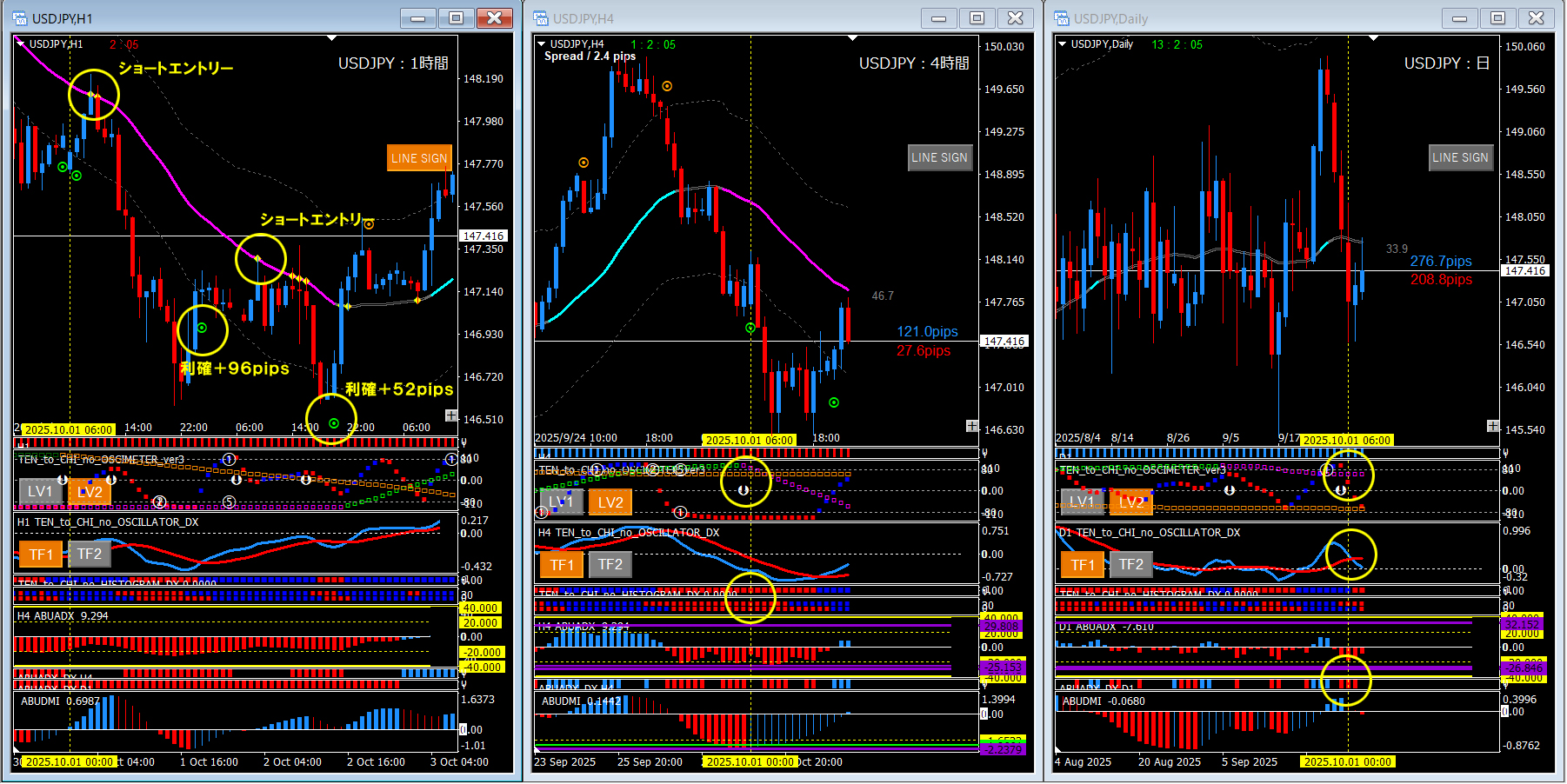 日足のABUADX_DXの点灯、その他のインジケーターの状態も良いので下目線と判断します。1時間足のショートエントリートリガーとしては、ラインタッチ、オシレーターTF1の下降転換、ABUDMIの色転換、などが狙えますね、