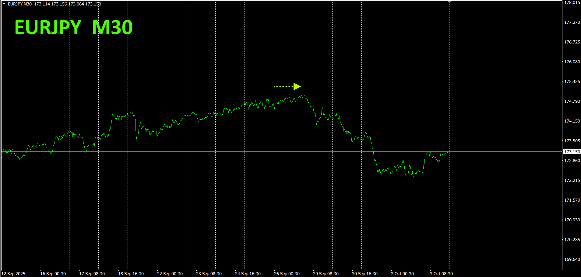 ピンク色がEUR、緑色がJPYです。EURは水平からやや上向きに、JPYはやや下向きになっています。あまりはっきりした方向が出ていませんが、EURJPYは、上昇気味に推移するものと考えられます。