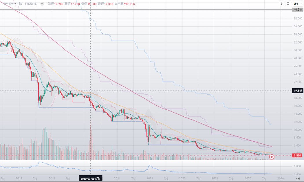 TRYJPY(トルコリラ円)の週足チャートです。