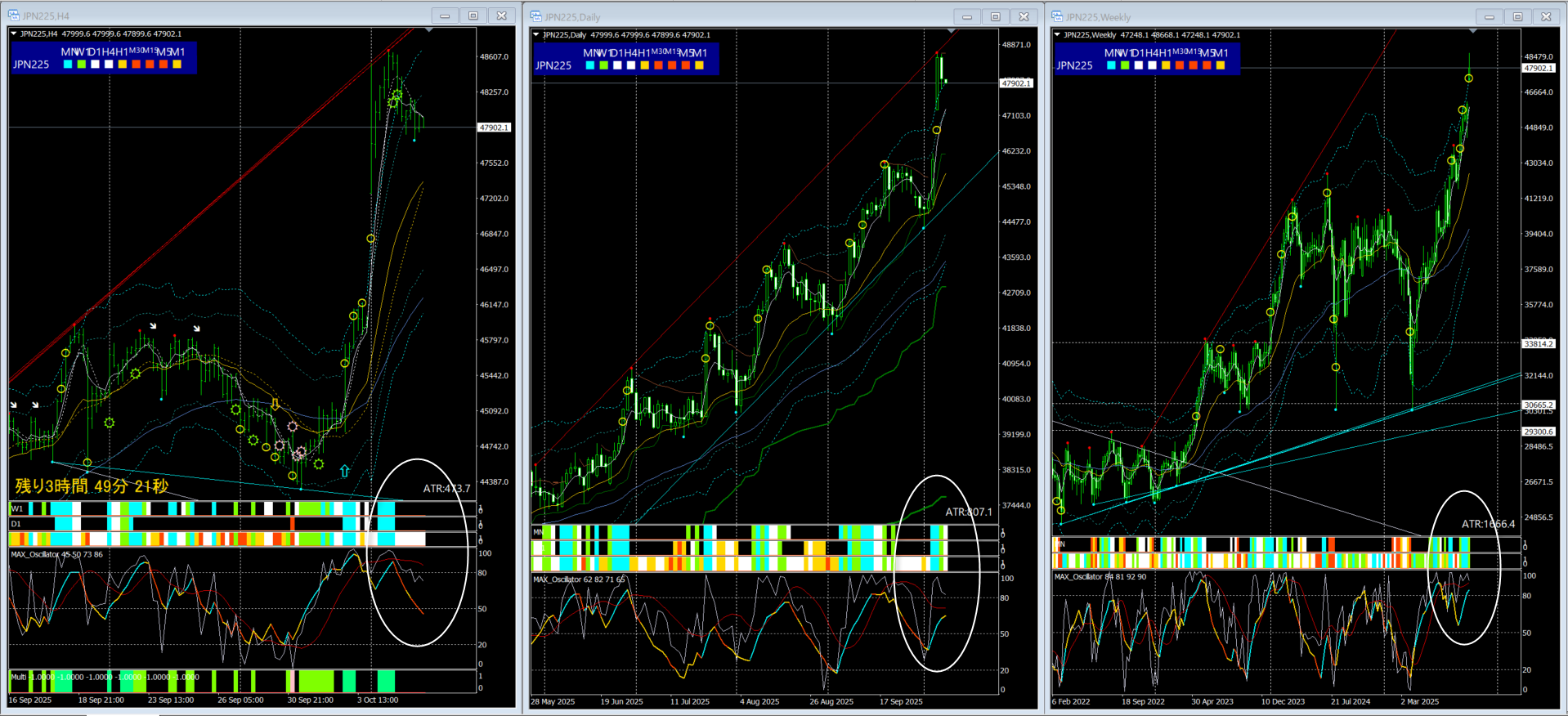 しかし、4時間足のMAXオシレーターは、レンジ気味に推移しやすい形で