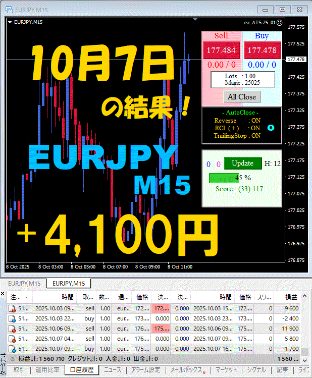 【EURJPY M15】前日の結果『ATS-25』 10月7日