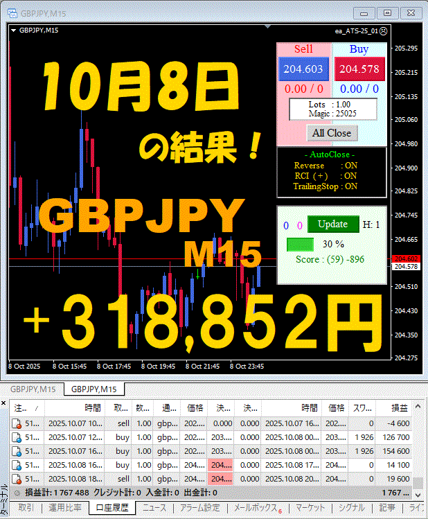 【GBPJPY M15】前日の結果『ATS-25』 10月8日