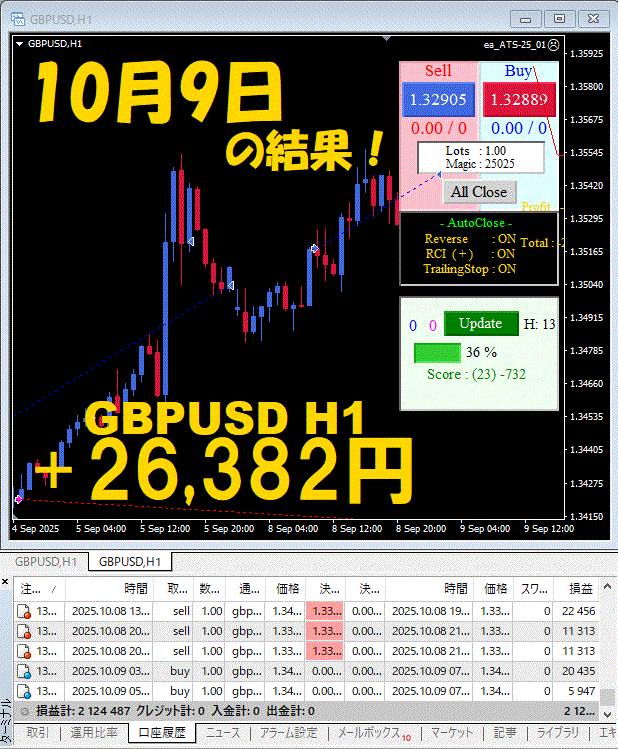 【前日の結果】GBPJPY H1 / M5 『ATS-25』10月9日