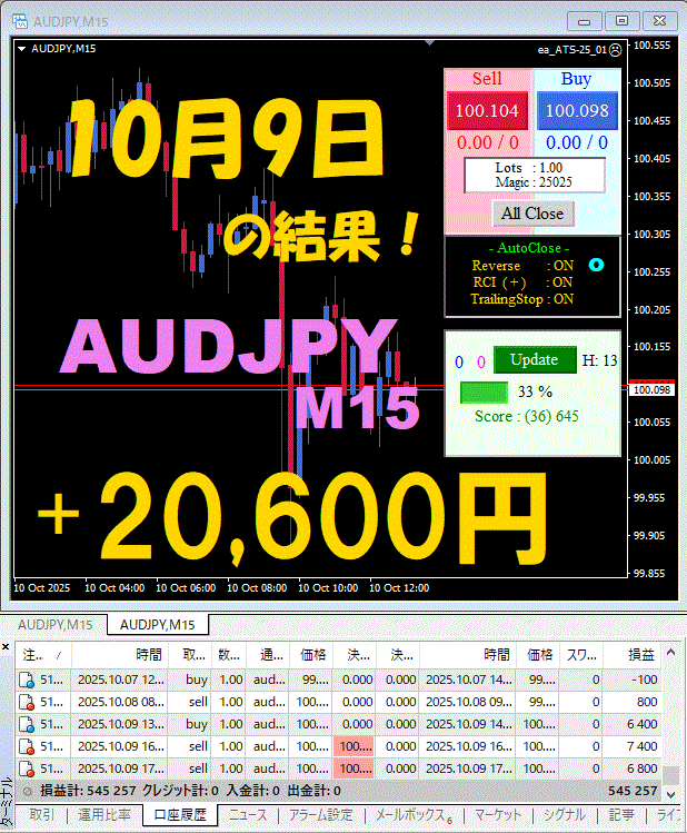 【AUDJPY M15】前日の結果『ATS-25』 10月9日