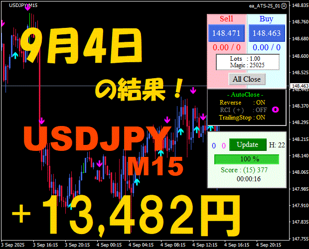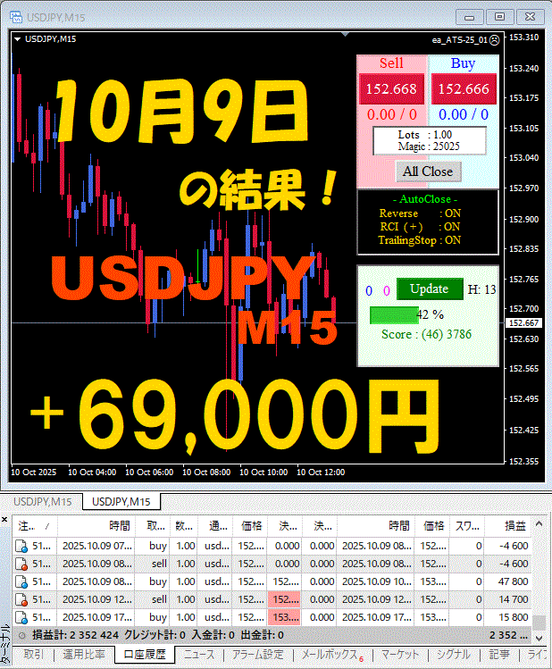 【USDJPY M15】前日の結果『ATS-25』 10月9日