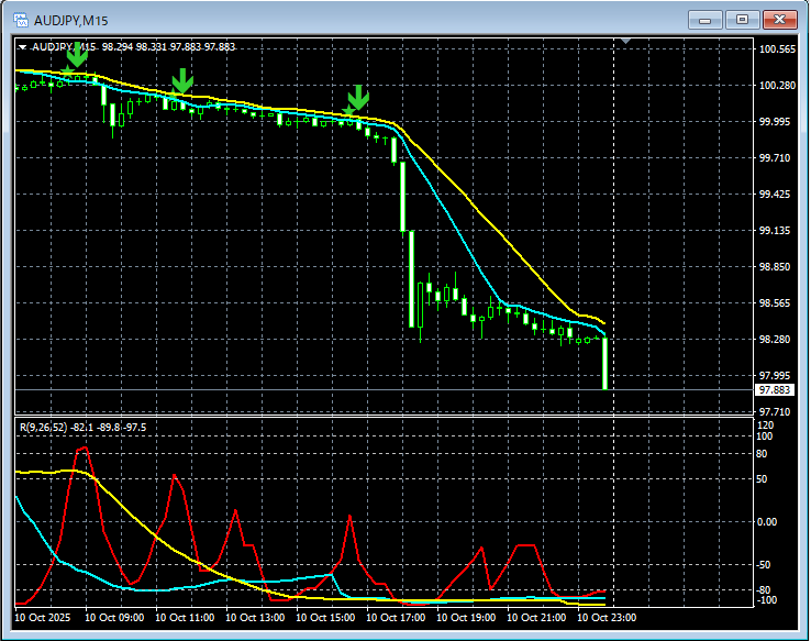 【RCIを極めて移動平均線フィルターで勝つ!!】昨日の豪ドル円15分足におけるmBDSRのサイン