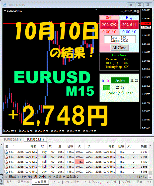 【EURUSD M15】前日の結果『ATS-25』 10月10日