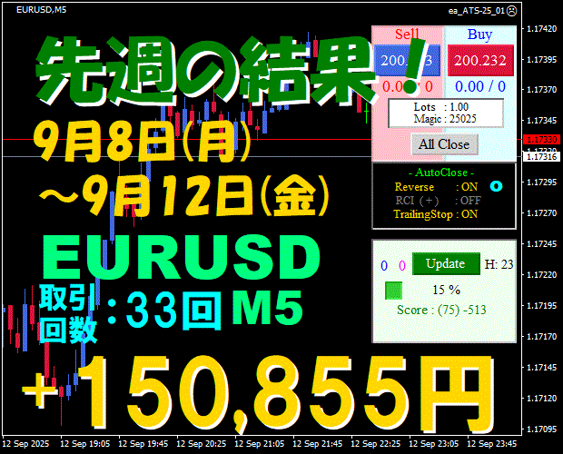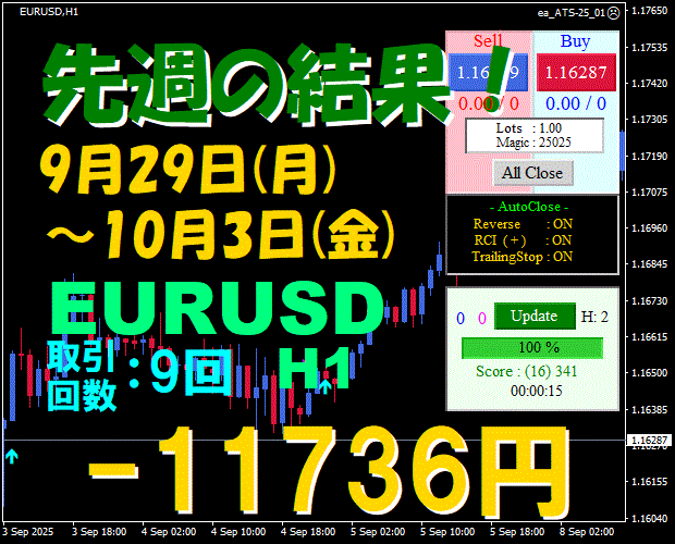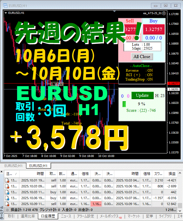 【先週の結果】EURUSD H1 『ATS-25』10月6日(月)~10月10日(金)