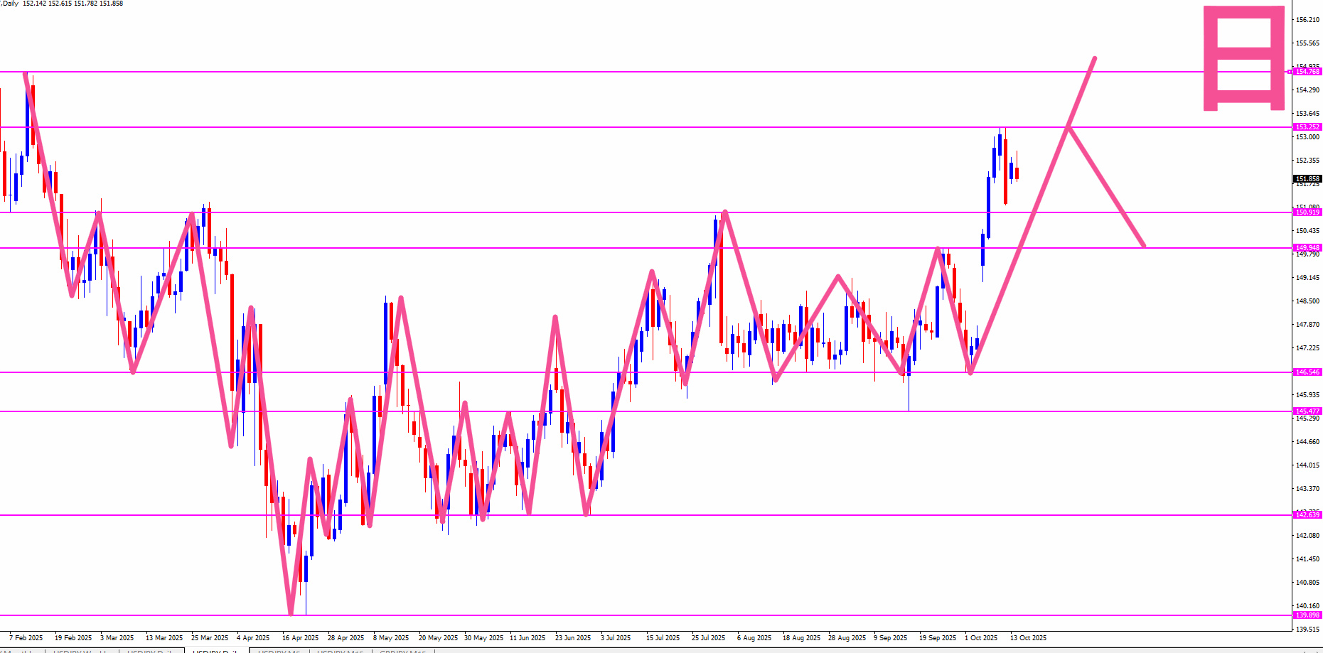●日 足:買い優勢 レンジ上限を突破し上昇中でありこのまま次の水平線(抵抗帯)まで上昇していくのか。一旦押し目をつくりにいく下降になるのか。という相場状況