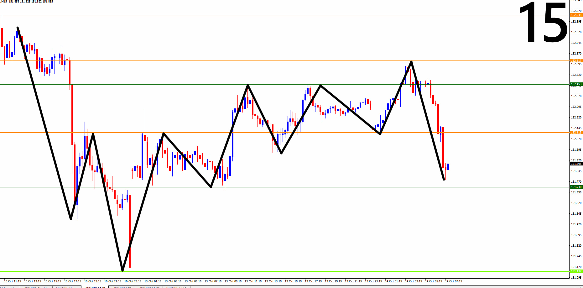 ●日足・4時間足・1時間足・15分足までの相場を水平線と波動(ダウ理論)を使って環境認識し、勝率の高いエントリーポイントを3つに絞る