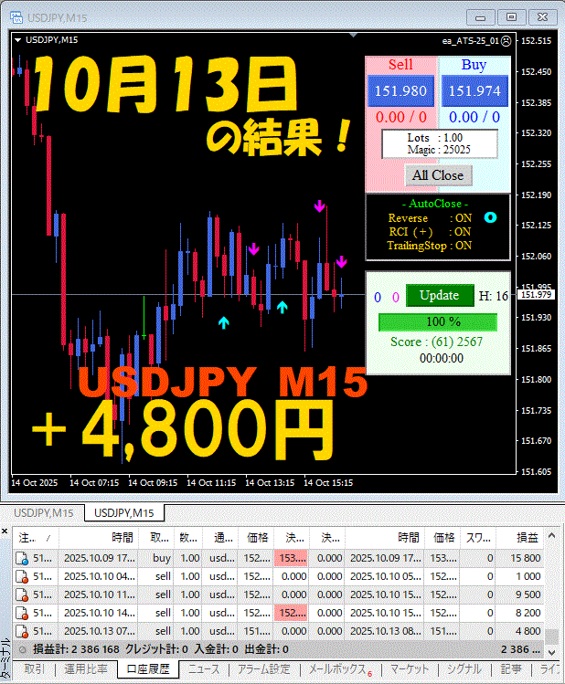 【USDJPY M15】前日の結果『ATS-25』 10月13日