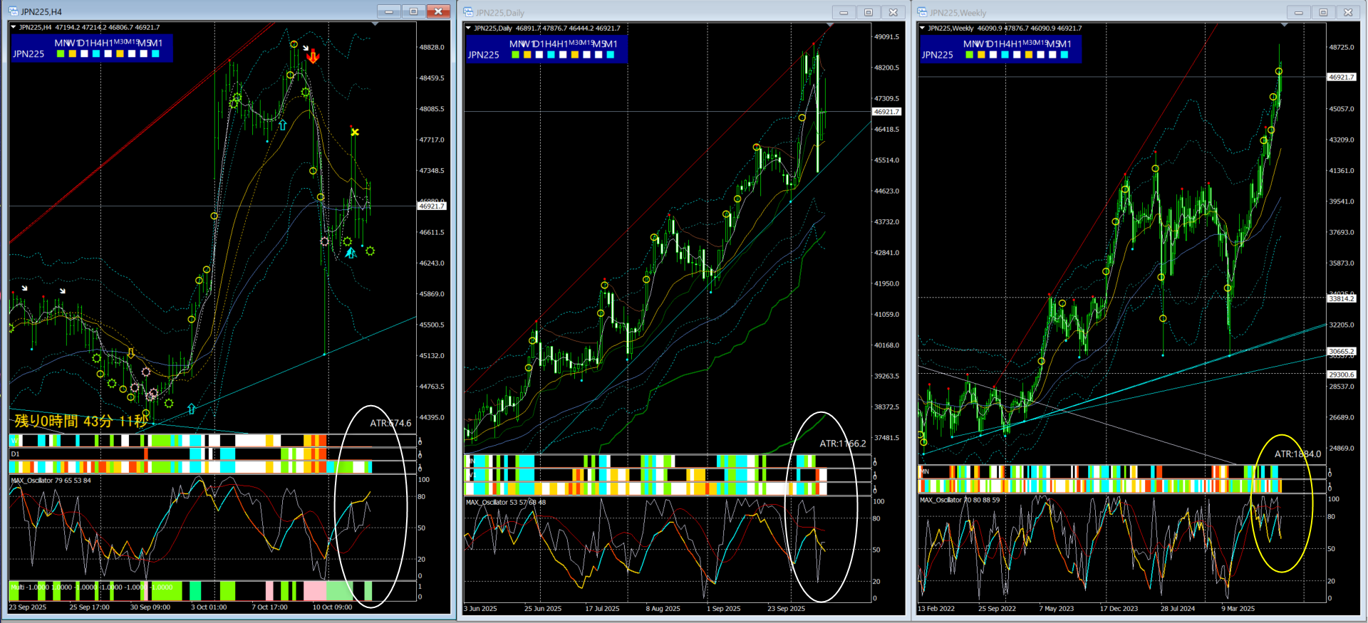 一方で、週足のMAXオシレーター、シンクロバンドは「弱い下落」を示唆