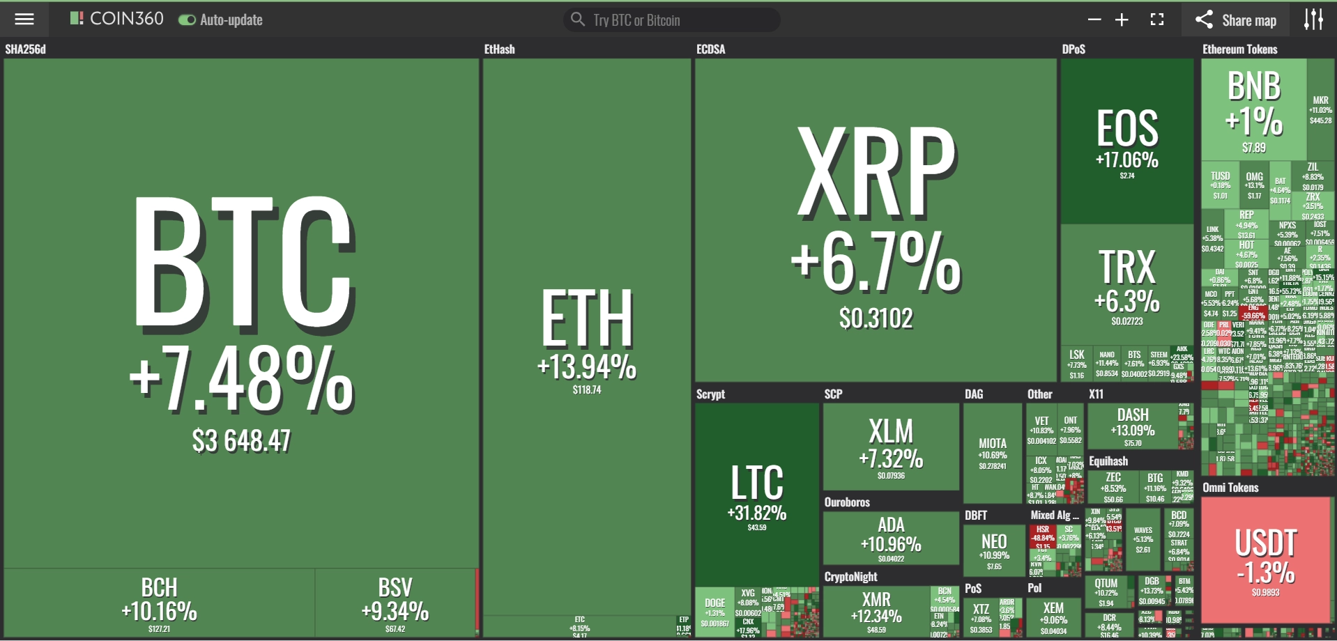 coinmarketcap(コインマーケットキャップ)のサイトから、ドミナンス(各銘柄が仮想通貨全体の時価総額に占めるパーセンテージ)を定点観測していきます。仮想通貨全般が下方向に大きく動き出している相場状況を受け、毎日更新することとし、仮想通貨業界を俯瞰および転換期を早期に発見することを目的とします。