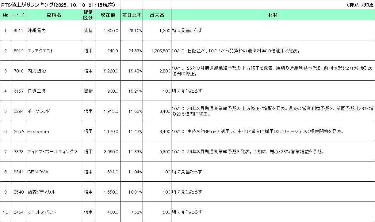 カブ知恵発 PTS値上がりTOP10(2025.10.16)