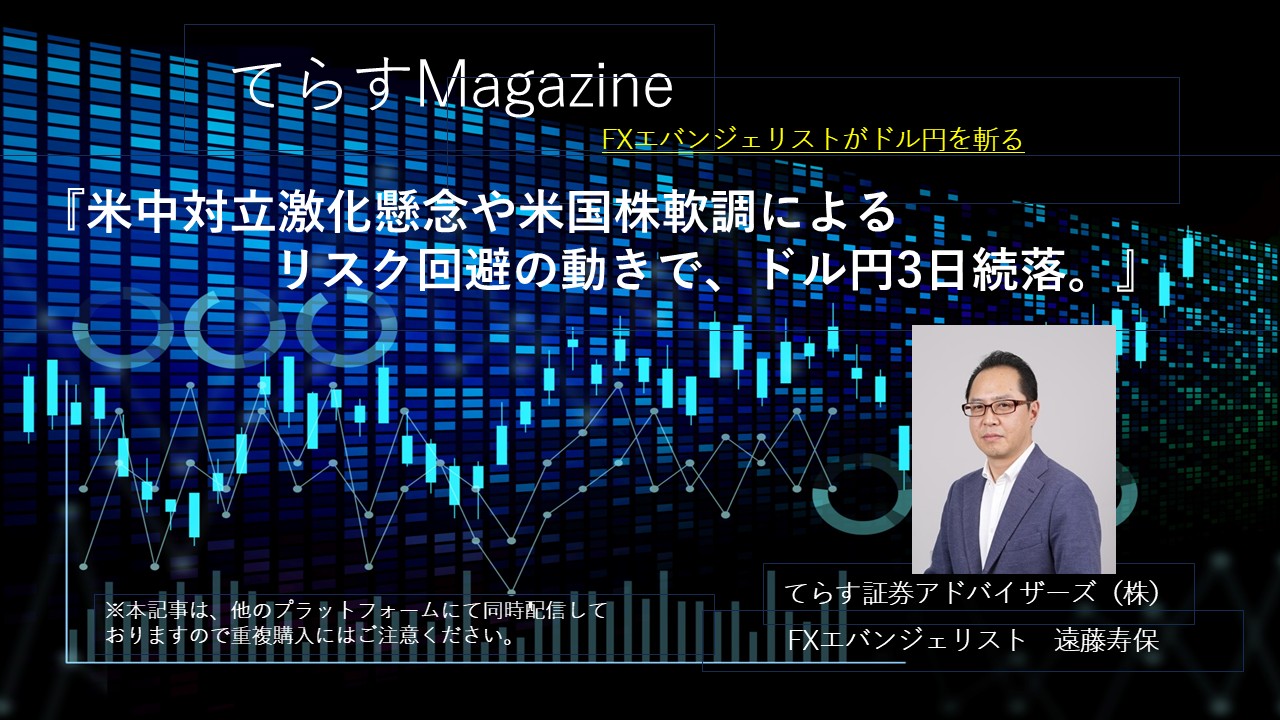 米中対立激化懸念や米国株軟調によるリスク回避の動きで、ドル円3日続落。