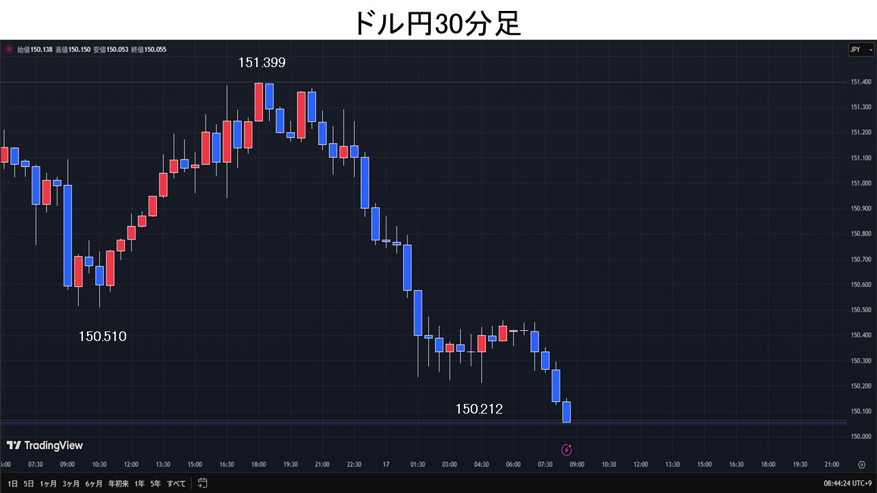 東京時間、ドル円は、加藤財務相が「円安方向で急激な動きがみられる」と発言。また、田村日銀審議委員が追加利上げを示唆したことから円買いが先行し、一時150.51円まで下落。その後は追随する売りはなく、日経平均が堅調に推移した事などを受け151.23円まで買い戻された。欧州時間、ドル円は、時間外の米10年債利回りの上昇を受け151.39円まで上昇。NY時間、10月米フィラデルフィア連銀製造業景気指数が▲12.8と予想の10.0を大幅下振れとなると、全般ドル売りが先行。米中の貿易摩擦の激化や米地銀の融資を巡る懸念などから、米国株相場が軟調となり、リスク回避の円買い・ドル売の流れで、ドル円は150.21円まで下落。