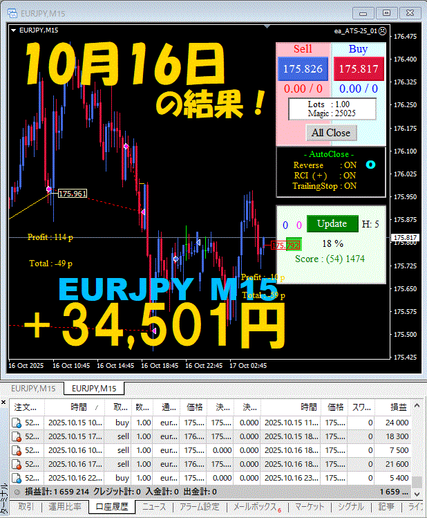 【EURJPY M15】前日の結果『ATS-25』 10月16日