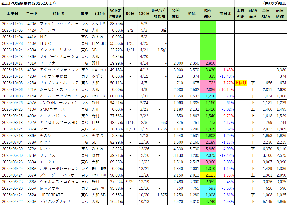 カブ知恵発 直近IPO銘柄動向(2025/10/17)