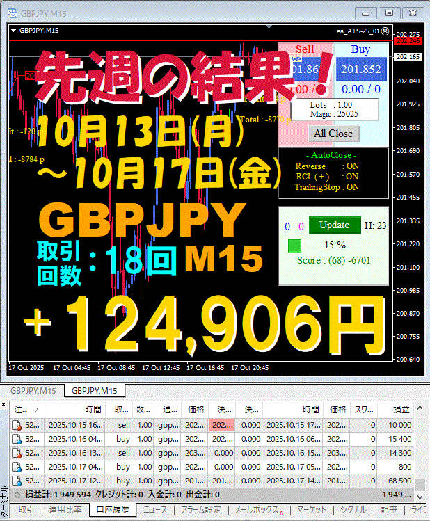 M15 週間報告!【GBPJPY】ATS-25 ☆10月13日(月)~10月17日(金)