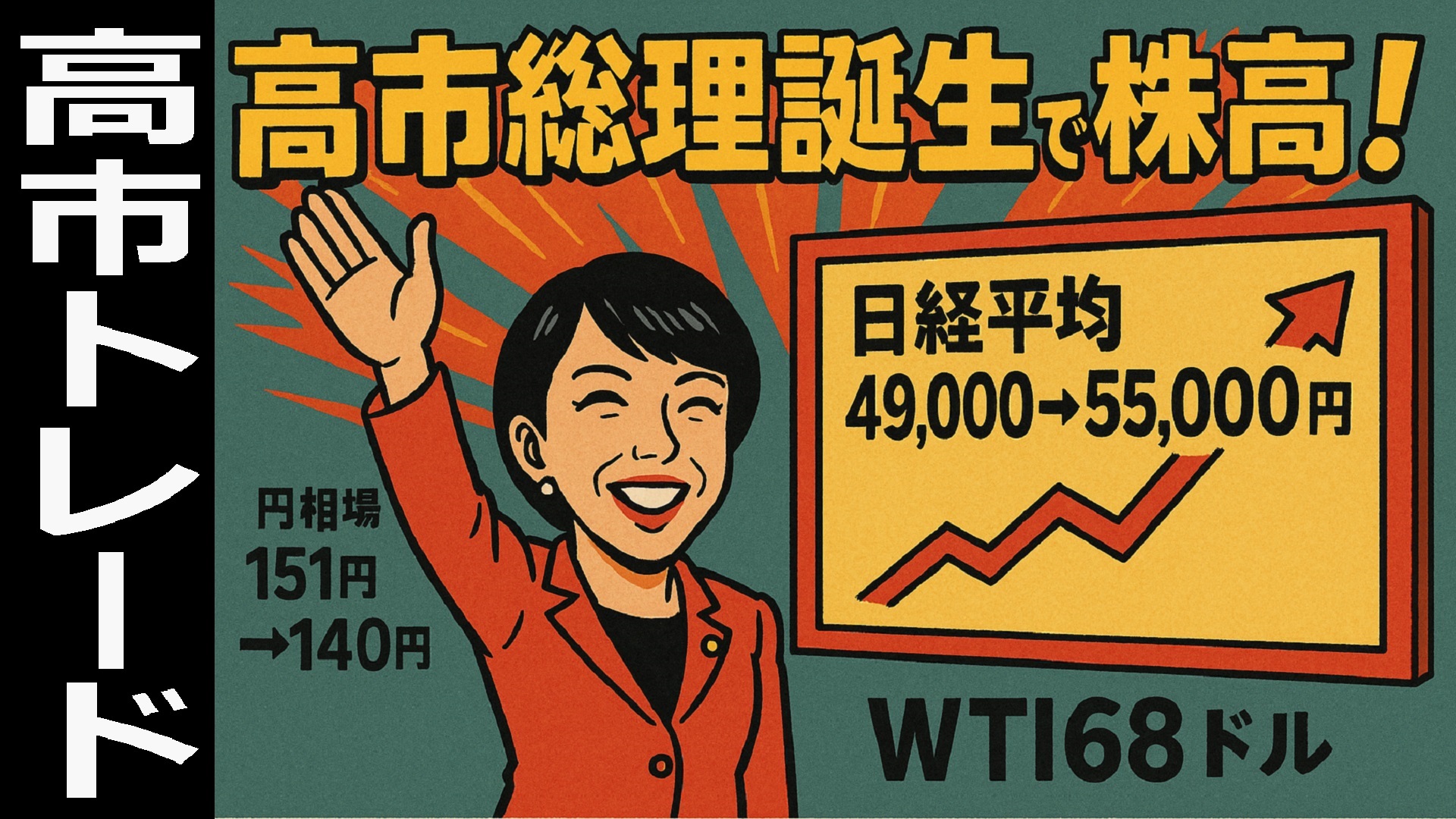 情報の整理から始めます。10月4日の自民党総裁選で高市早苗氏が新総裁に選出され、10月21日の首班指名選挙で就任が「ほぼ確定」との見方が広がっています。市場はこれを織り込み、日経平均は前週末比で大幅高、終値ベースで約4万9,185円。先週終値から1,603円上昇し、最高値を更新しました。