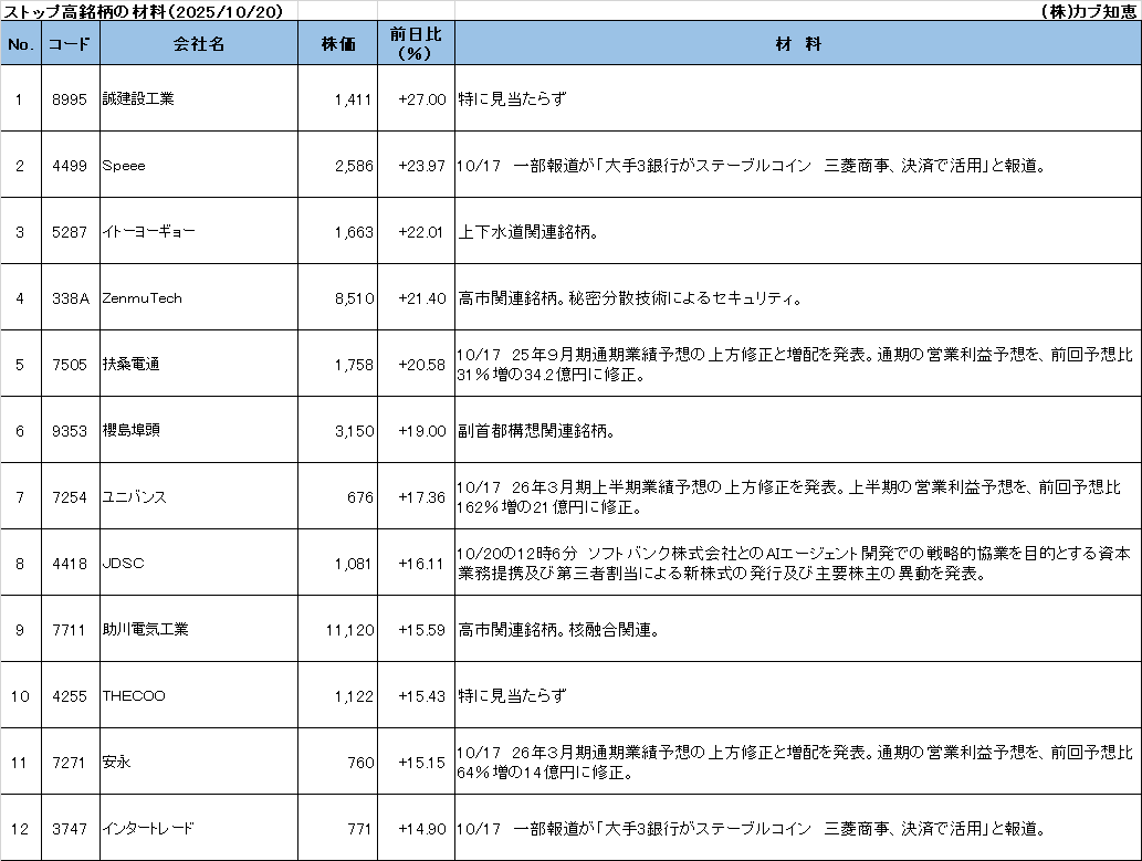 カブ知恵発 ストップ高銘柄の材料(2025/10/20)