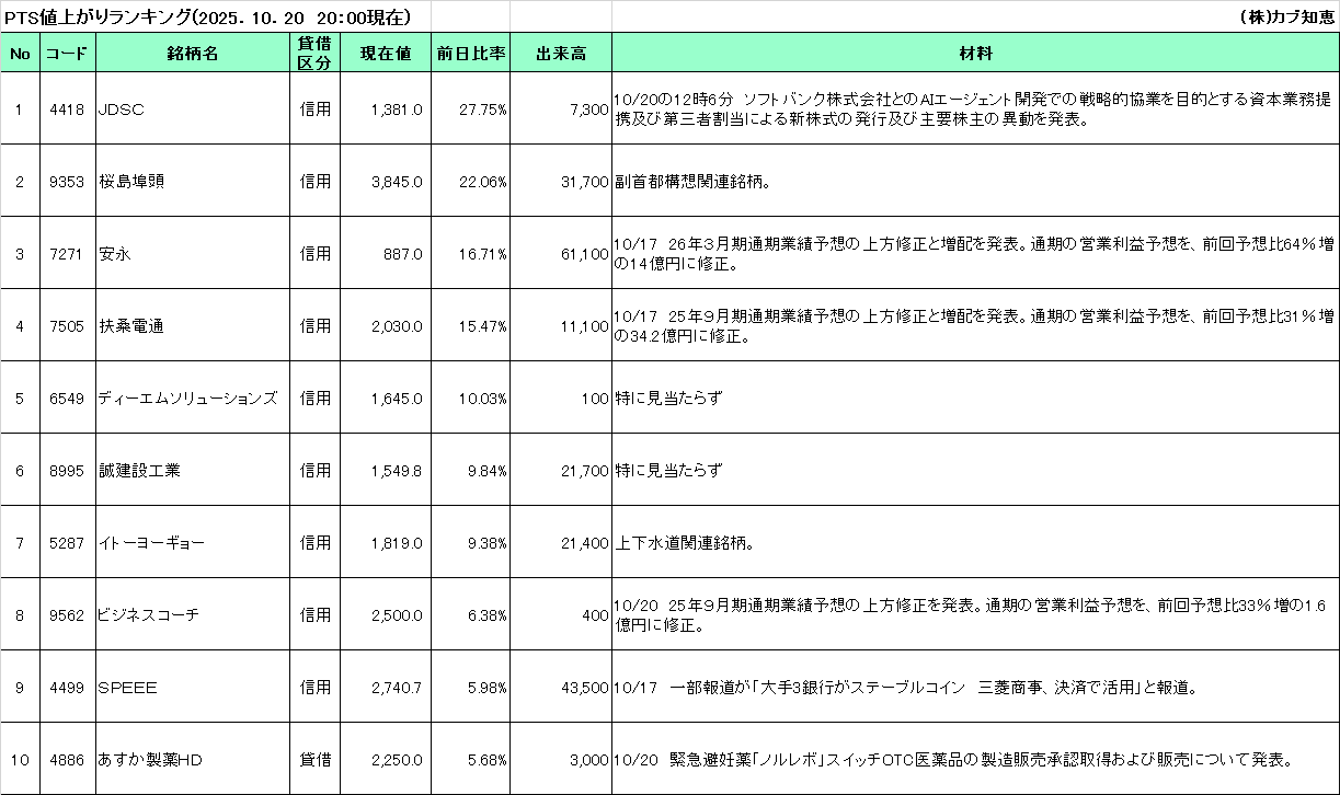 カブ知恵発 PTS値上がりTOP10(2025/10/20)
