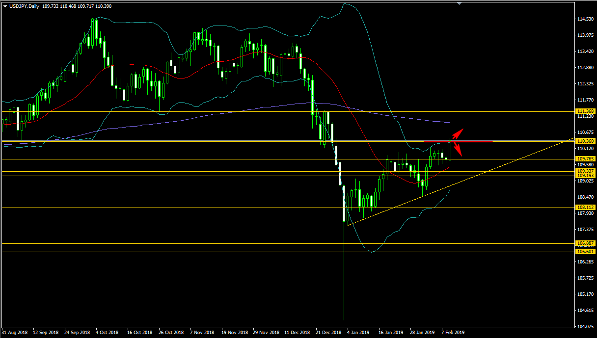 ドル円の日足チャートから見てみます。ドル円日足では、先日1時間足チャートがトレンドラインブレイクし現在一段階上の強めと思われるレジスタンスラインであるドル円110.360円まで到達し、そこで一旦止められている状況となっています。ここより更に上に行くのか下に弾き返されるのかのパターンになり一段階上に行けば新たなステージで現値が推移する事になります。