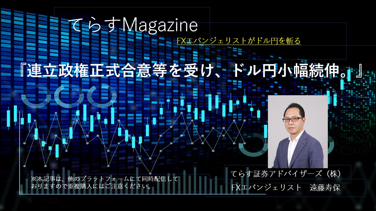 連立政権正式合意等を受け、ドル円小幅続伸。