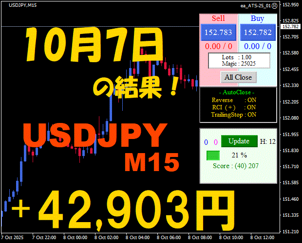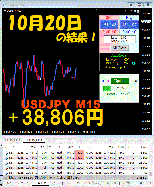 【USDJPY M15】前日の結果『ATS-25』 10月20日