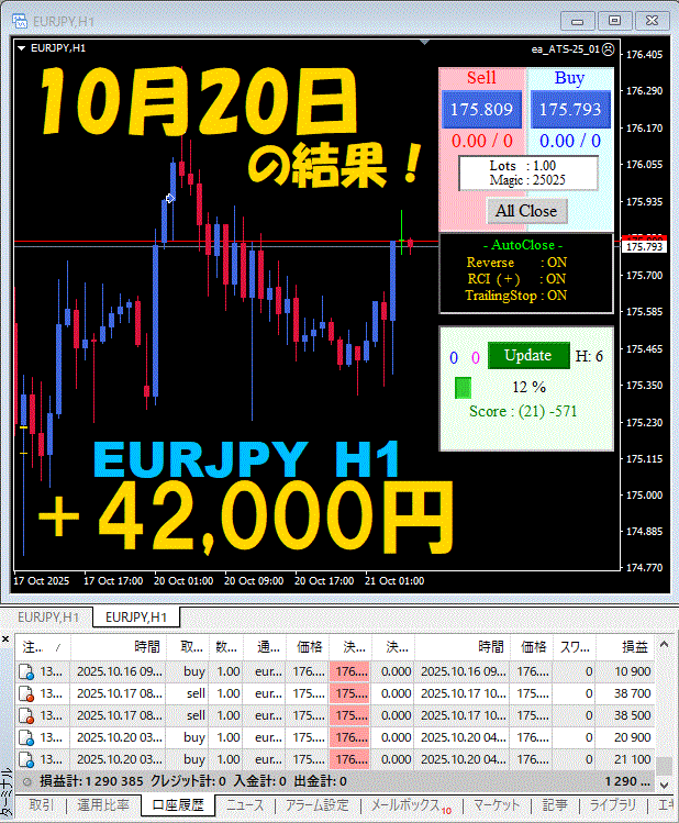 【前日の結果】EURJPY H1 / M5 『ATS-25』10月20日