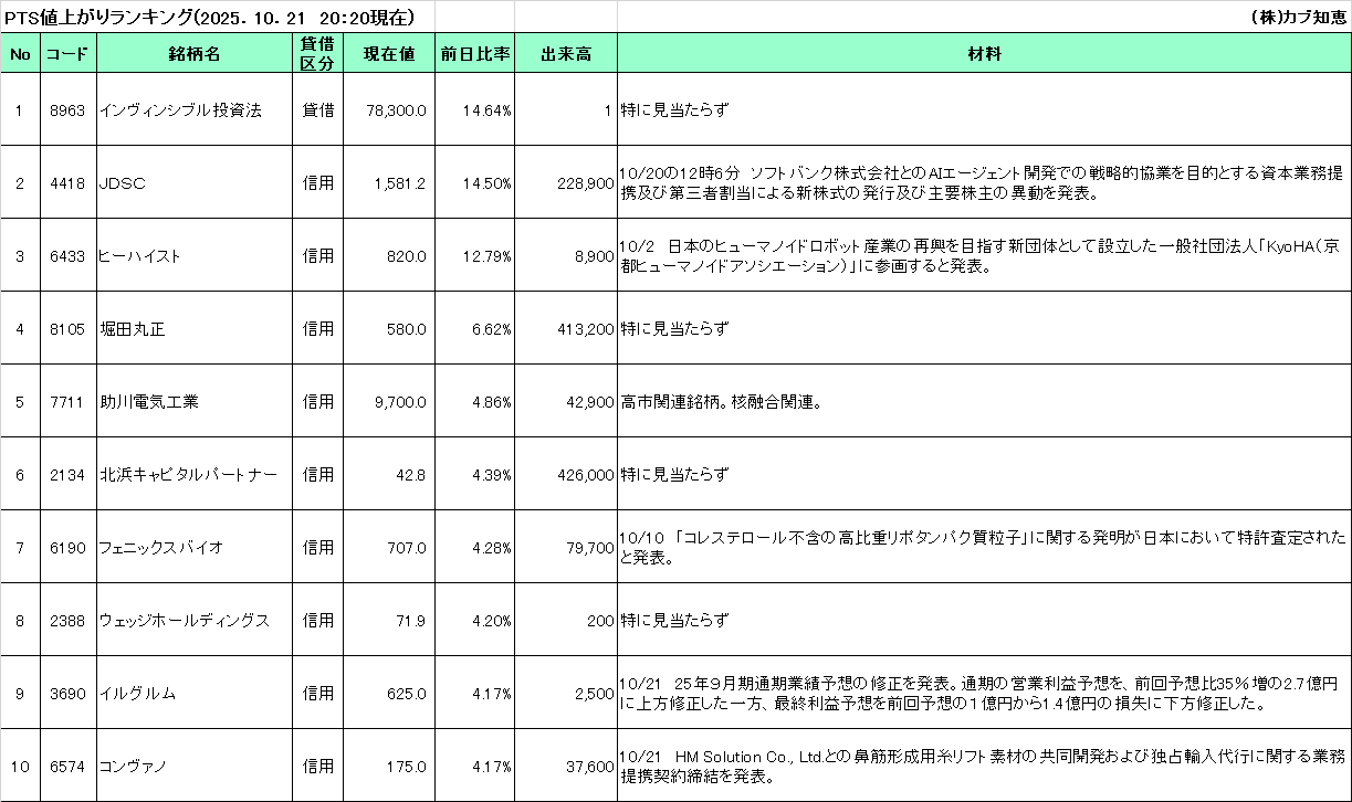 カブ知恵発 PTS値上がりTOP10(2025/10/21)