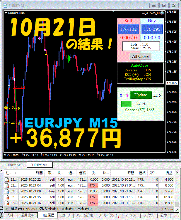 【EURJPY M15】前日の結果『ATS-25』 10月21日