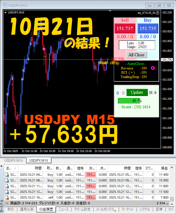 【USDJPY M15】前日の結果『ATS-25』 10月21日