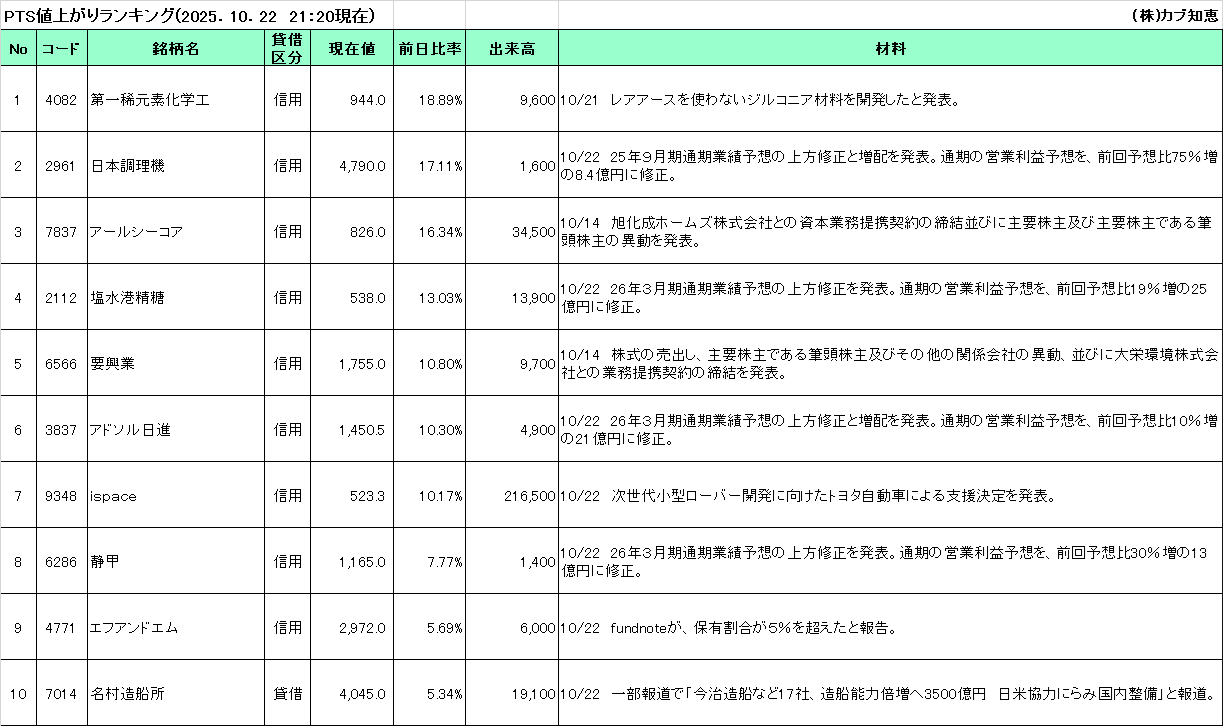 カブ知恵発 PTS値上がりTOP10(2025/10/22)