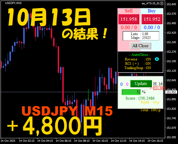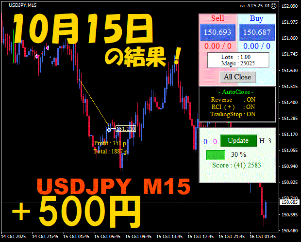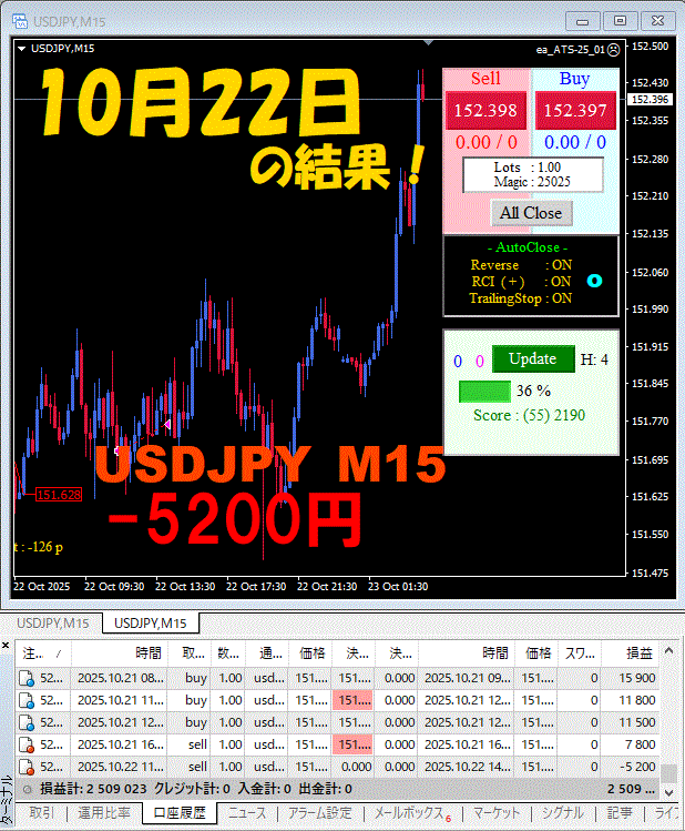 【USDJPY M15】前日の結果『ATS-25』 10月22日